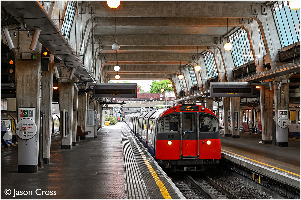 A train of 1973 Tube Stock arrives at Uxbridge with a Piccadilly Line service from South Harrow. Date: 3 June 2025 Manipulation Notes: None