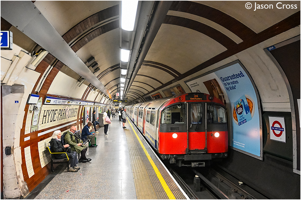1973 Tube Stock 110-510-310 leads into Hyde Park Corner with a Heathrow Terminal 4 to Cockfosters Piccadilly Line service. Date: 3 June 2025 Manipulation Notes: None