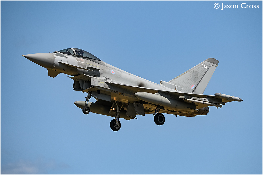 Royal Air Force Eurofighter Typhoon FGR4 ZK314 on final approach to RAF Coningsby runway 25, returning to base after playing a part in a flypast over London to celebrate the King's official birthday. Date: 14 June 2025 Manipulation Notes: None