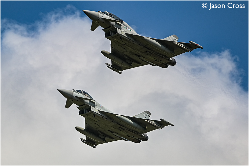 Royal Air Force Eurofighter Typhoon FGR4 ZK330 and T3 ZK383 returning to RAF Coningsby after playing a part in a flypast over London to celebrate the King's official birthday. Date: 14 June 2025 Manipulation Notes: None