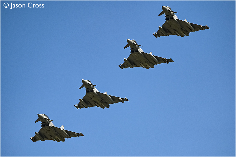 Royal Air Force Eurofighter Typhoons ZK325, ZK427, ZK362 and ZK381 returning to RAF Coningsby after playing a part in a flypast over London to celebrate the King's official birthday. Date: 14 June 2025 Manipulation Notes: None