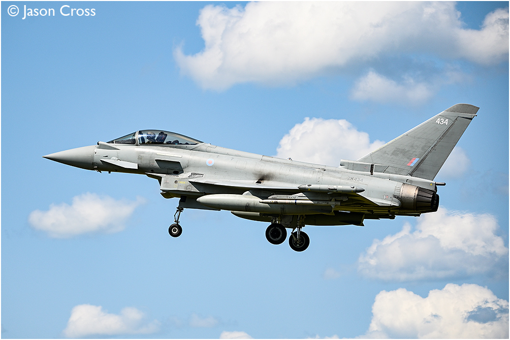 Royal Air Force Eurofighter Typhoon FGR4 ZK434 on final approach to RAF Coningsby runway 25, returning to base after playing a