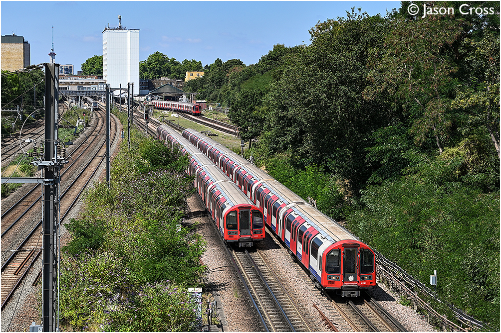 Central Line trains of 1992 Tube Stock pass each other outside Ealing Broadway station. Date: 13 July 2025 Manipulation Notes: None Camera mounted on a tall pole and remotely fired