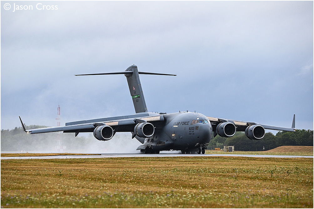 USAF Boeing C17 Globemaster 08-8203 lands at a wet RAF Fairford. Date: 20 July 2025 Manipulation Notes: None
