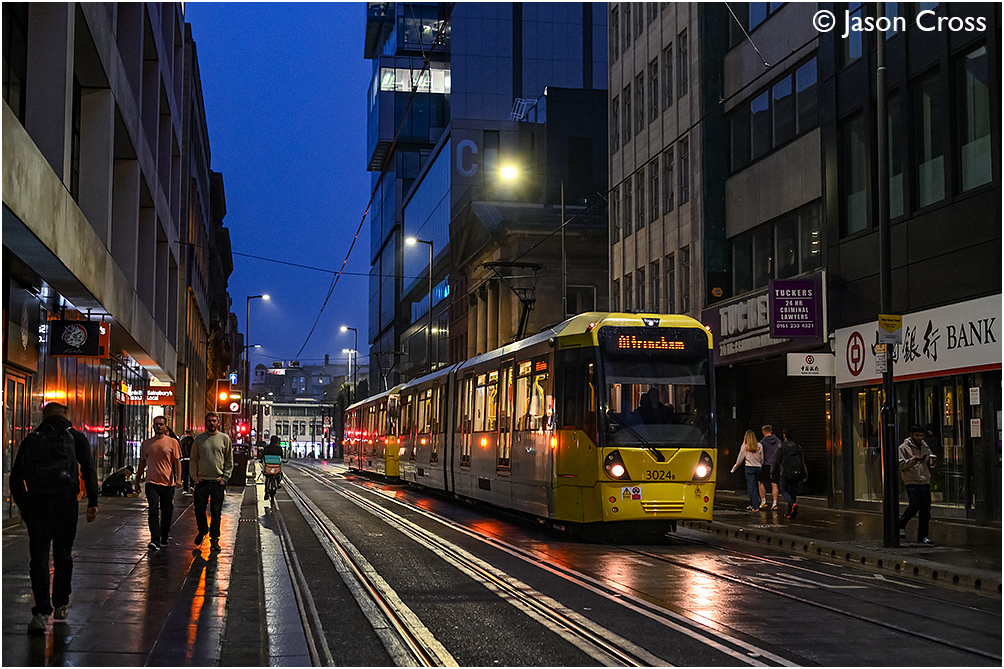 3024 and 3046 on Mosley Street in Manchester with a Metrolink service for Altrincham. Date: 23 July 2025 Manipulation Notes: None