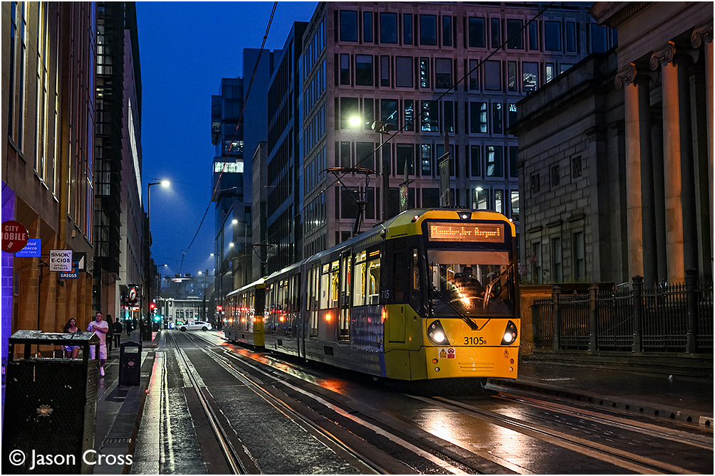 3105 and 3093 on Mosley Street in Manchester with a Metrolink service for Manchester Airport. Date: 23 July 2025 Manipulation Notes: None