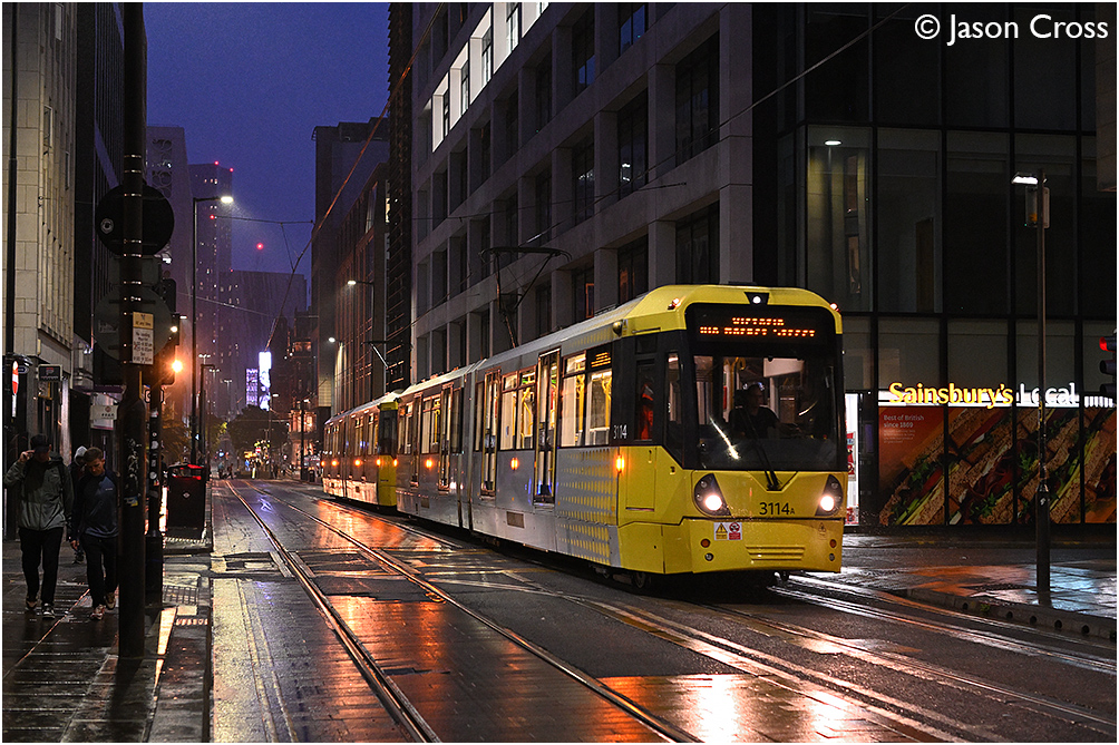3114 and 3109 on Mosley Street in Manchester with a Metrolink service for Victoria. Date: 23 July 2025 Manipulation Notes: None