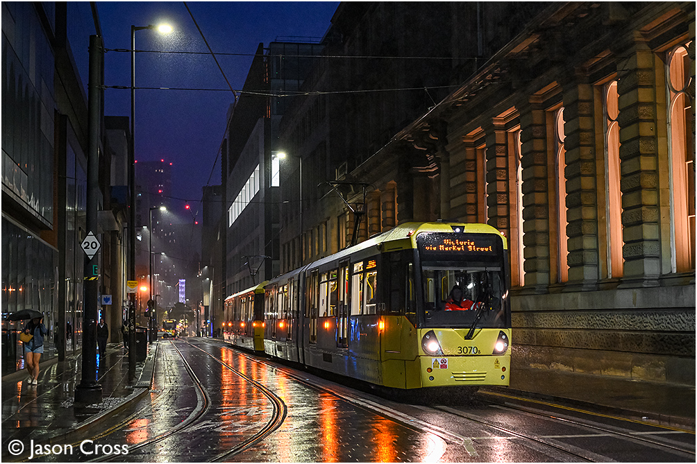 3070 and 3083 on Mosley Street in Manchester with a Metrolink service for Victoria. Date: 23 July 2025 Manipulation Notes: None
