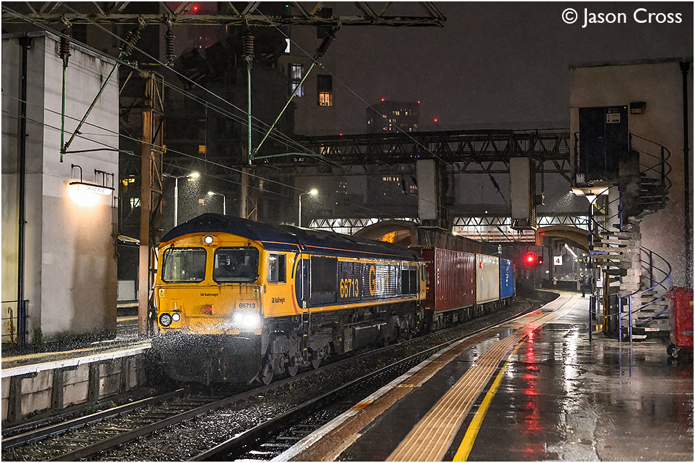66713 'Forest City' passes through Manchester Oxford Road in a downpour with the 4L22 Trafford Park to Felixstowe South. Date: 23 July 2025 Manipulation Notes: None