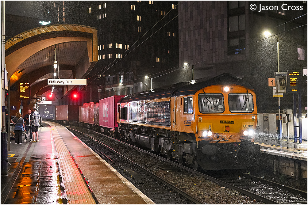 66782 passes through Manchester Oxford Road at the head of the 4M46 1419 Southampton West Docks to Trafford Park. Date: 23 July 2025 Manipulation Notes: None
