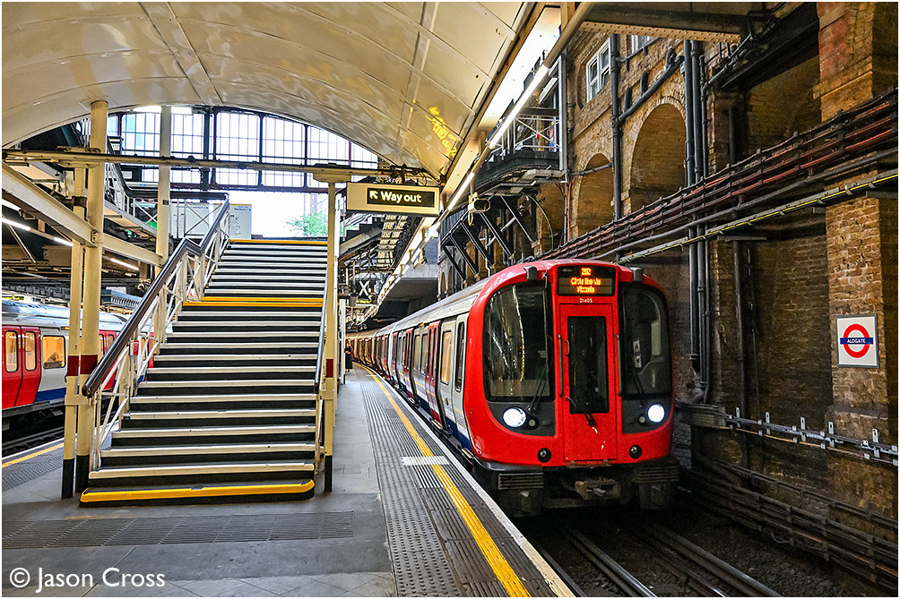 A Hammersmith to Edgware Road Circle Line service arrives at Aldgate worked by S Stock 21405. Date: 30 July 2025 Manipulation Notes: None