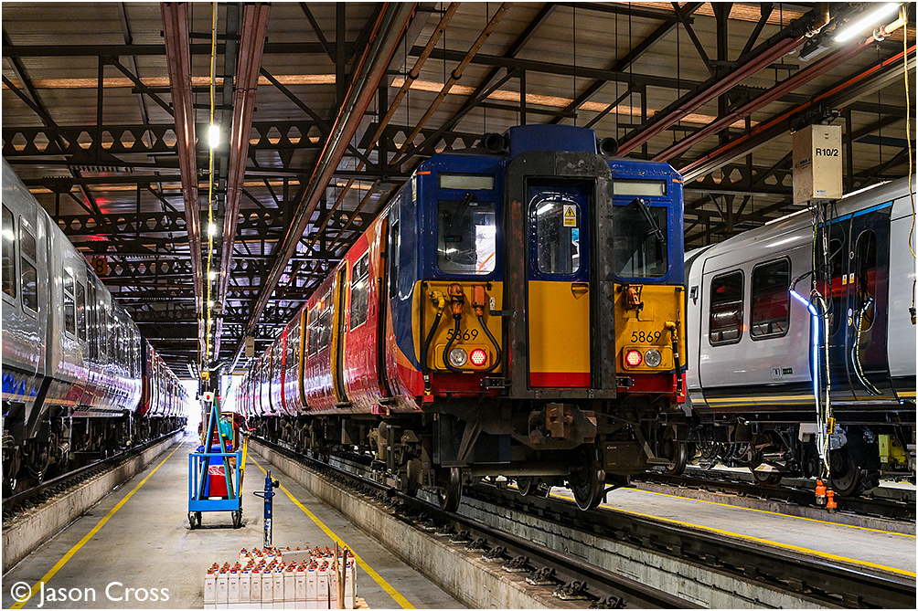 5869 inside the Inspection Shed at Wimbledon Depot. (Photo taken with permission and from a position of safety). Date: 30 July 2025 Manipulation Notes: None