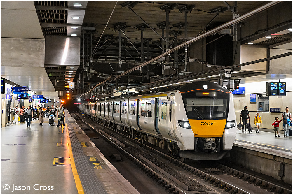 700129 arrives at St Pancras International with a Bedford to Brighton Thameslink service. Date: 30 July 2025 Manipulation Notes: None