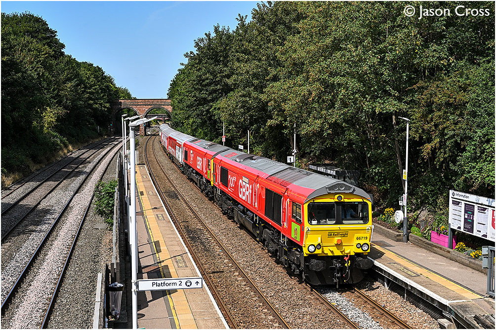 66719 and 66710 at Barrow-upon-Soar with the 'Inspiration Train' running as a 3Z34 0910 Derby Litchurch Lane to Wembley Yard. Date: 6 August 2025 Manipulation Notes: None