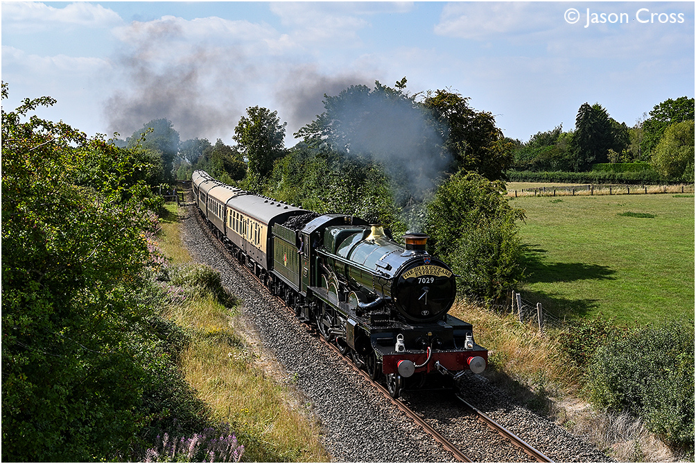 7029 'Clun Castle' passes Edstone with a 1Z74 1335 Stratford-upon-Avon to Birmingham Snow Hill 'Shakespeare Express' railtour. Date: 10 August 2025 Manipulation Notes: None Camera mounted on a tall pole and remotely fired