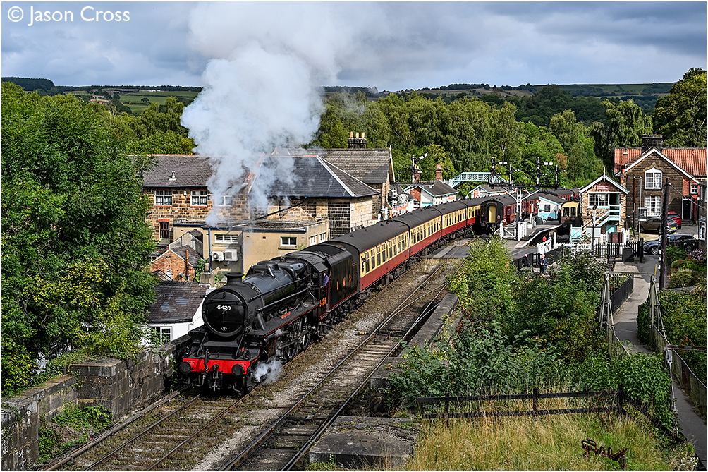 'Black 5' 5428 'Eric Treacy' powers away from Grosmont with the 1000 Whitby to Pickering service. Date: 23 August 2025 Manipulation Notes: None Camera mounted on a tall pole and remotely fired