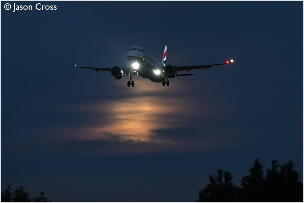 Moonlit Heathrow approach, British Airways Airbus A320 G-TTNY on final approach to 27L with a flight from Lisbon. Date: 7 October 2025 Manipulation Notes: None