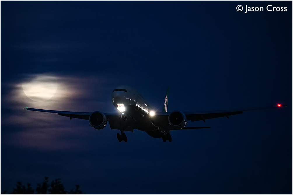 Moonlit Heathrow approach, EVA Air Boeing 777 B-16737 on final approach to 27L with a flight from Bangkok. Date: 7 October 2025 Manipulation Notes: None