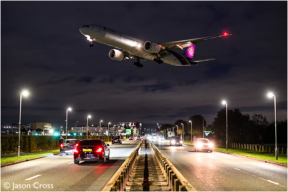 Thai Airways Boeing 777 HS-TKW passes over the A30 on final approach to Heathrow's runway 27L with a flight from Bangkok. Date: 7 October 2025 Manipulation Notes: None