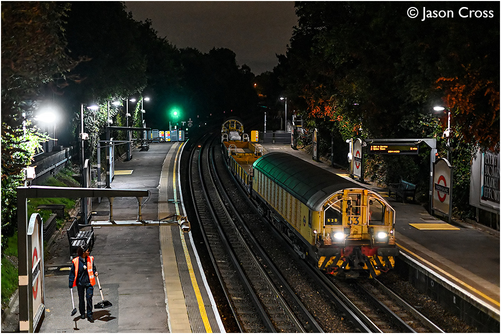 Battery loco L53 heads train 620, a 2337 Ruislip Depot to Euston (Northern Line Bank Branch) engineering train through North Ealing. Date: 8 October 2025 Manipulation Notes: None