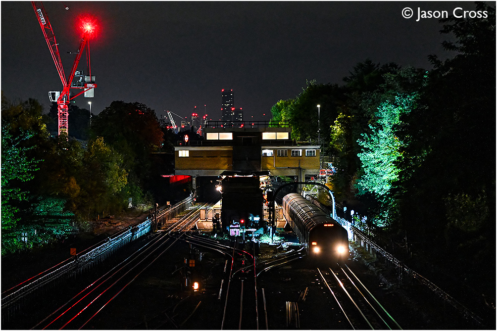 With DM 91323 leading, train 51, the 2345 Epping to West Ruislip Central Line service arcs as it departs from Northolt. Date: 8 October 2025 Manipulation Notes: None