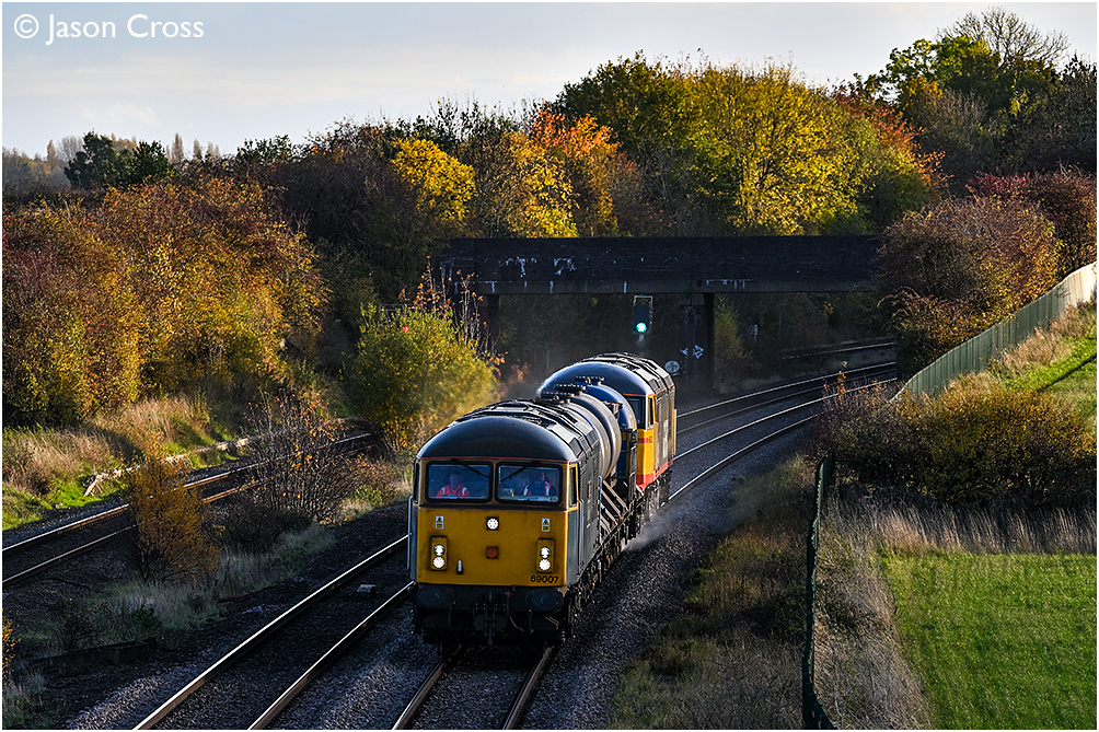 69007 leads 69015 as they pass Thurmaston with the 3J41 1413 Peterborough GBRf Depot to Peterborough via Leicester Humberstone Road Railhead Treatment Train. Date: 2 November 2025 Manipulation Notes: None