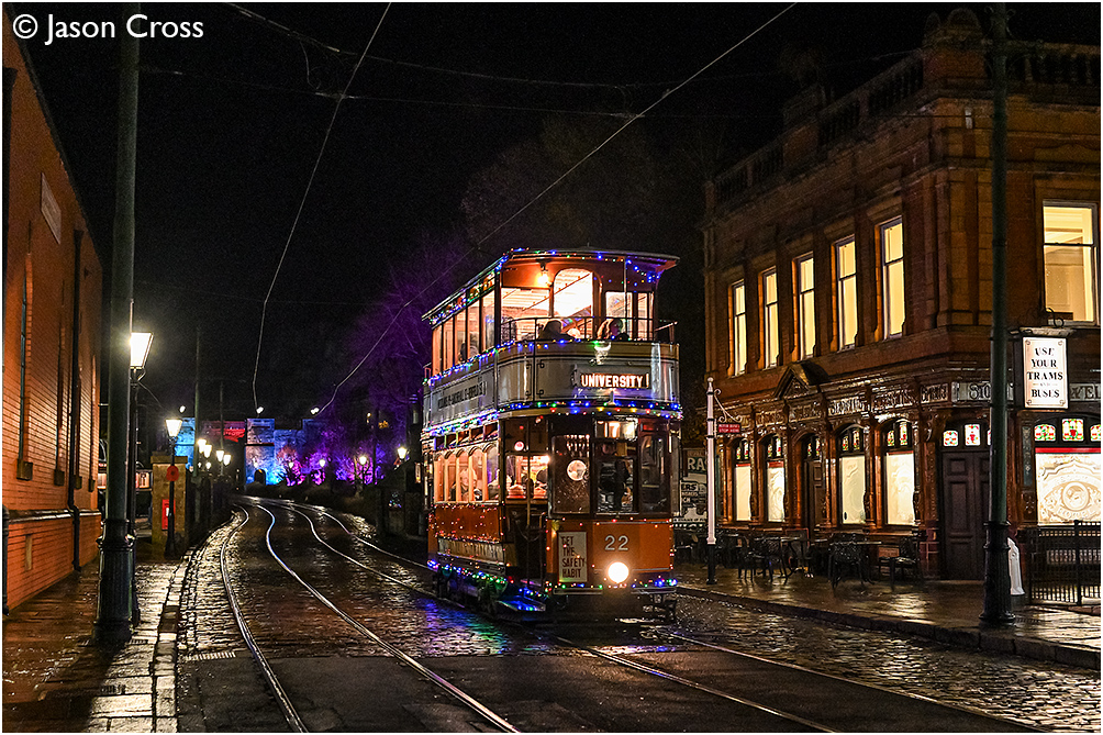 Glasgow 22 passes the pub on the approach to Town End. Crich Tramway Village 'Tramlight' event. Date: 9 November 2025 Manipulation Notes: None