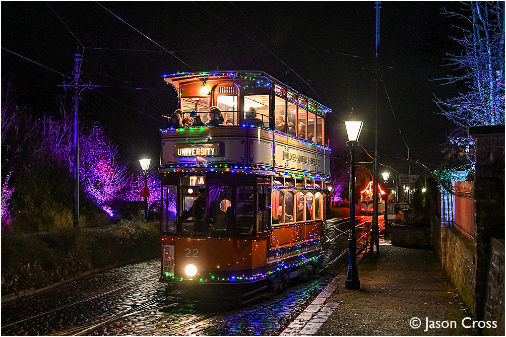 Glasgow 22 enters the interlaced track section to pass beneath the Bowes-Lyon bridge. Crich Tramway Village 'Tramlight' event. Date: 9 November 2025 Manipulation Notes: None