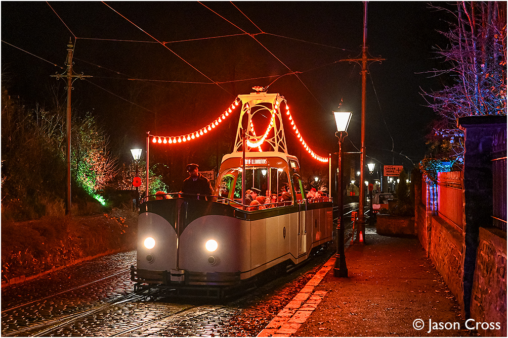 Blackpool 236 enters the interlaced track section to pass beneath the Bowes-Lyon bridge. Crich Tramway Village 'Tramlight' event. Date: 9 November 2025 Manipulation Notes: None