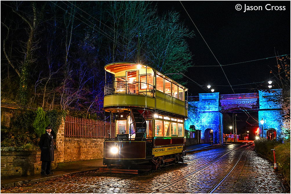 Chesterfield 7 waits to enter the tram depot at the end of the evening. Crich Tramway Village 'Tramlight' event. Date: 9 November 2025 Manipulation Notes: None