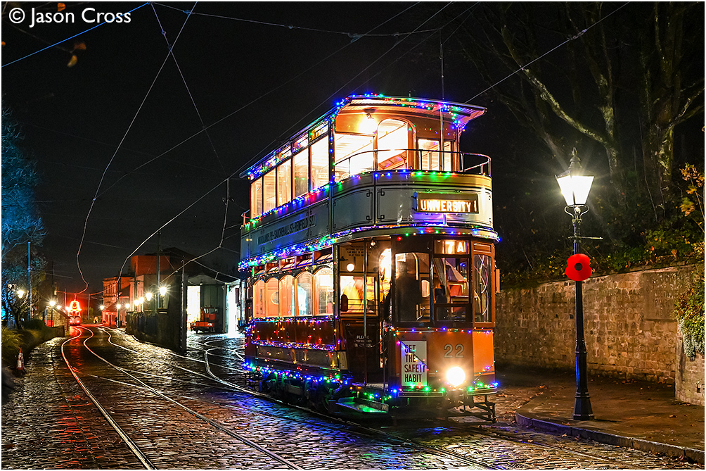 Glasgow 22 arrives back at the tram depot at the end of the evening. Crich Tramway Village 'Tramlight' event. Date: 9 November 2025 Manipulation Notes: None