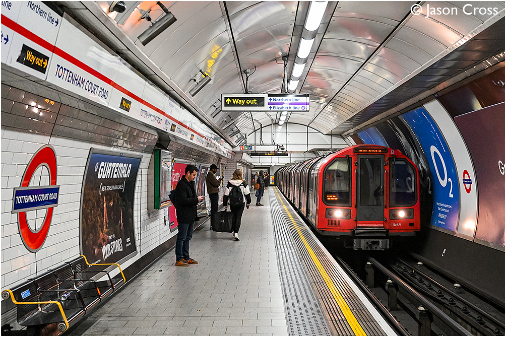 An Epping to West Ruislip Central Line service arrives at Tottenham Court Road with DM 91069 leading. Date: 19 November 2025 Manipulation Notes: None