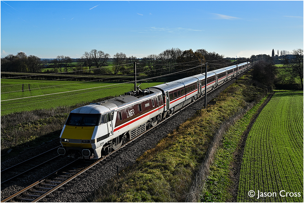 91109 'Sir Bobby Robson' approaches Askham Tunnel with 1N81 0906 London King's Cross to York. Date: 21 November 2025 Manipulation Notes: None Camera mounted on a tall pole and remotely fired