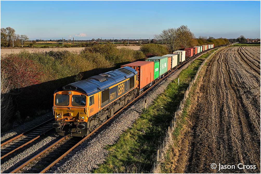 66311 powers away from Helpston and leaves the ECML behind with 4M29 1046 Felixstowe North to Birch Coppice. Date: 21 November 2025 Manipulation Notes: None Camera mounted on a tall pole and remotely fired