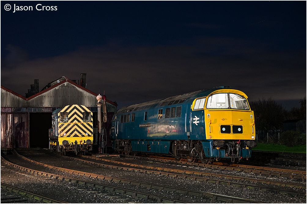 D1023 'Western Fusilier' and 08604 'Phantom' posed in front of the main engine shed at Didcot.