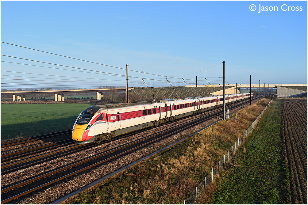 800109 races under the A14 on the approach to Offord Cluny with 1A13 0656 Skipton to London King's Cross. Date: 13 December 2025 Manipulation Notes: None Camera mounted on a tall pole and remotely fired