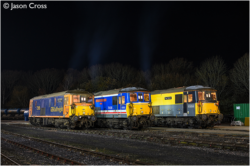 73109 'Battle of Britain 80th Anniversary', 73128 'Kent & East Sussex Railway' and 73119 'Paul Taylor' at Tonbridge West Yard. Northern Diesel Photo Charters photo shoot. Date: 13 December 2025 Manipulation Notes: None