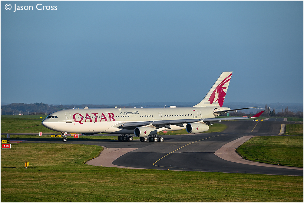 A rare visitor in the form of Qatar Airbus A340 A7-HHK taxiing for departure from East Midlands Airport with a Doha to New York JFK flight that had stopped at EMA for a tech stop. Date: 26 December 2025 Manipulation Notes: None