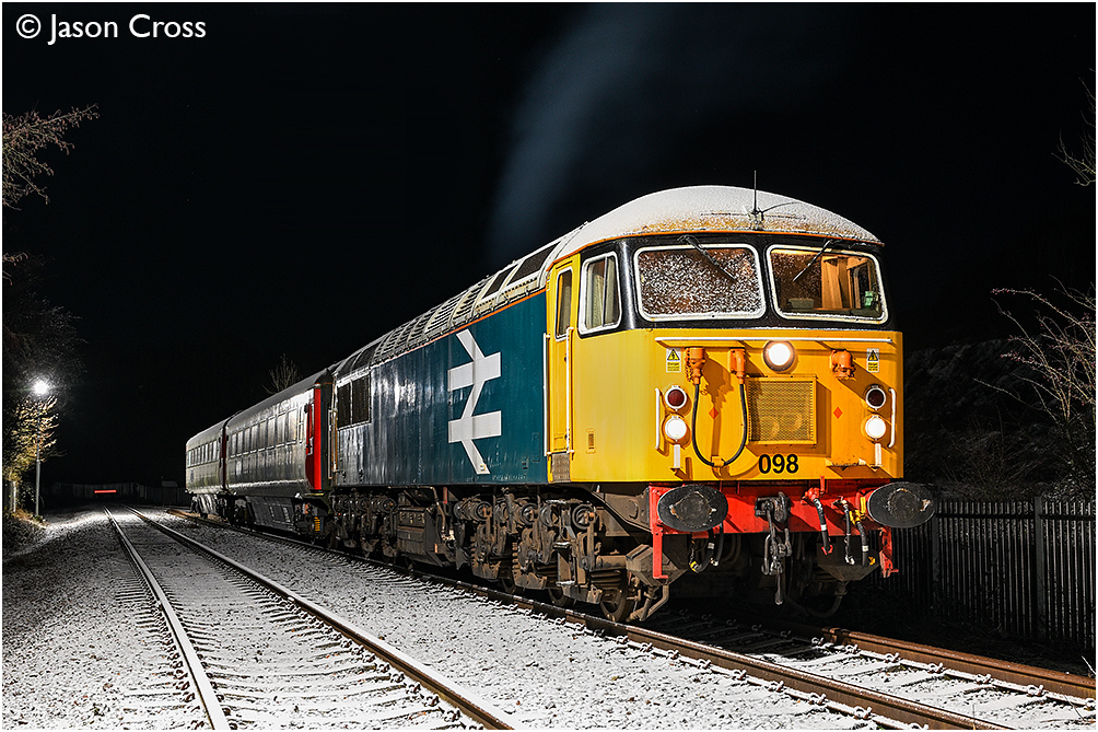 With a light dusting of snow on the ground, 56098 is seen coupled to a couple of mark 3 carriages at the Asfordby Test Centre. Date: 2 January 2026 Manipulation Notes: None