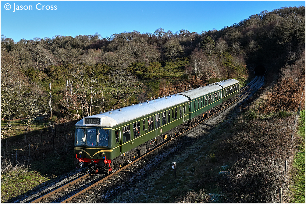 Class 108 DMU 51941+59250+52064 leaves Bewdley Tunnel with the 1230 Kidderminster to Bewdley. Severn Valley Railway Winter Steam Gala. Date: 3 January 2026 Manipulation Notes: None Camera mounted on a tall pole and remotely fired