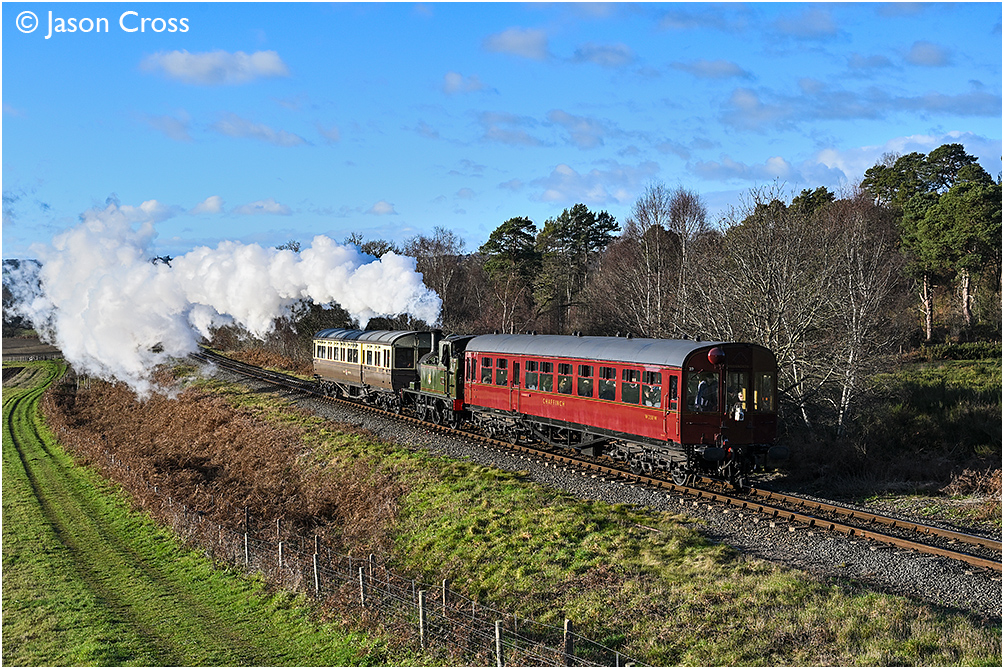 1450 climbs past Rifle Range with the 1247 Highley to Kidderminster auto train. Severn Valley Railway Winter Steam Gala. Date: 3 January 2026 Manipulation Notes: None Camera mounted on a tall pole and remotely fired