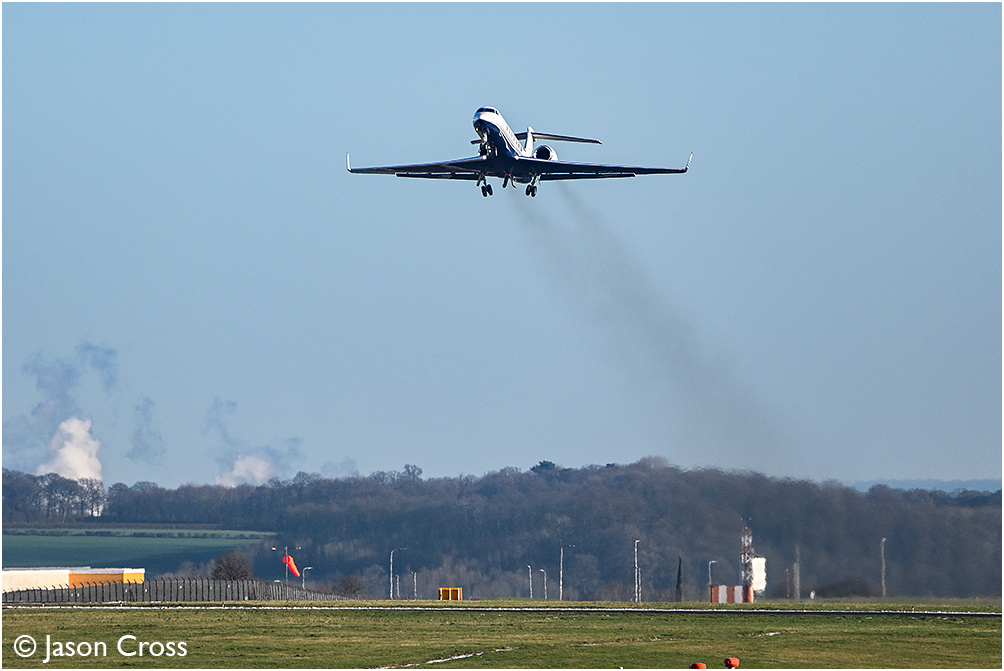 Gulfstream G550 G-LSCW takes off from East Midlands Airport. Date: 4 January 2026 Manipulation Notes: None