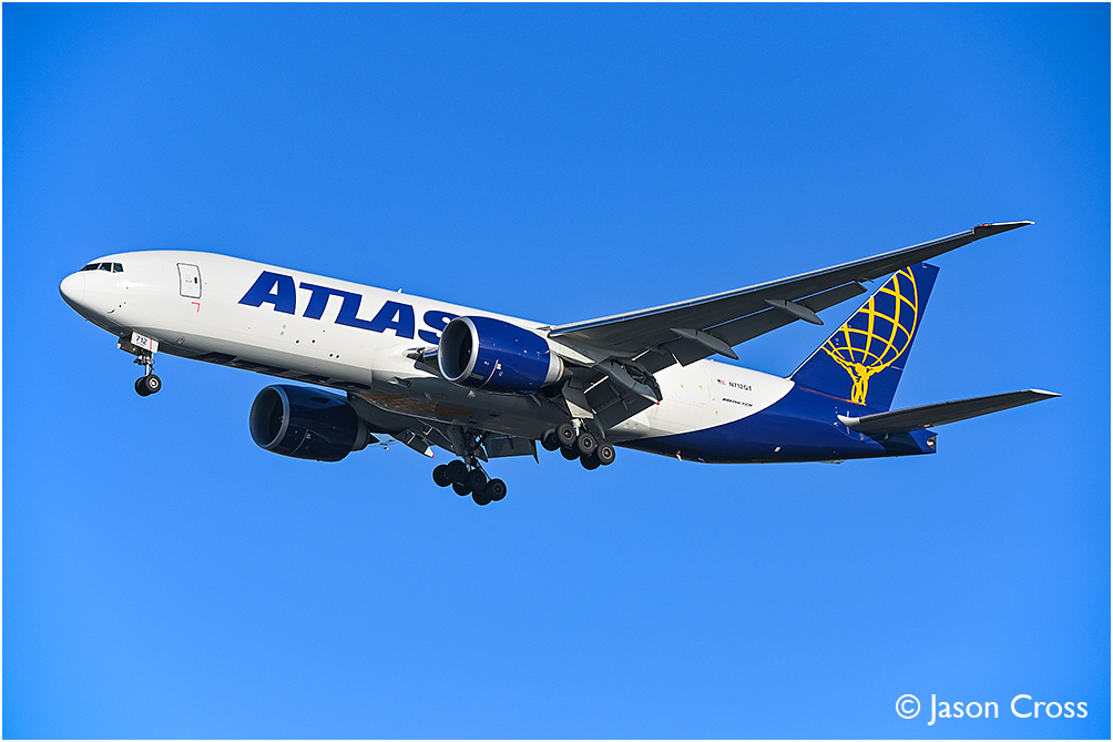 Atlas Air Boeing 777 N712GT on final approach to runway 27 at East Midlands Airport with a cargo flight from Baku. Date: 10 January 2026 Manipulation Notes: None