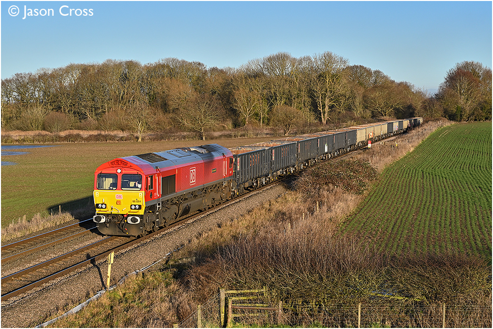 66091 'Accurascale' passing Rearsby with a 4Z41 1328 Peterborough West Yard to Mountsorrel Sidings empty stone train. Date: 10 January 2026 Manipulation Notes: None Camera mounted on a tall pole and remotely fired