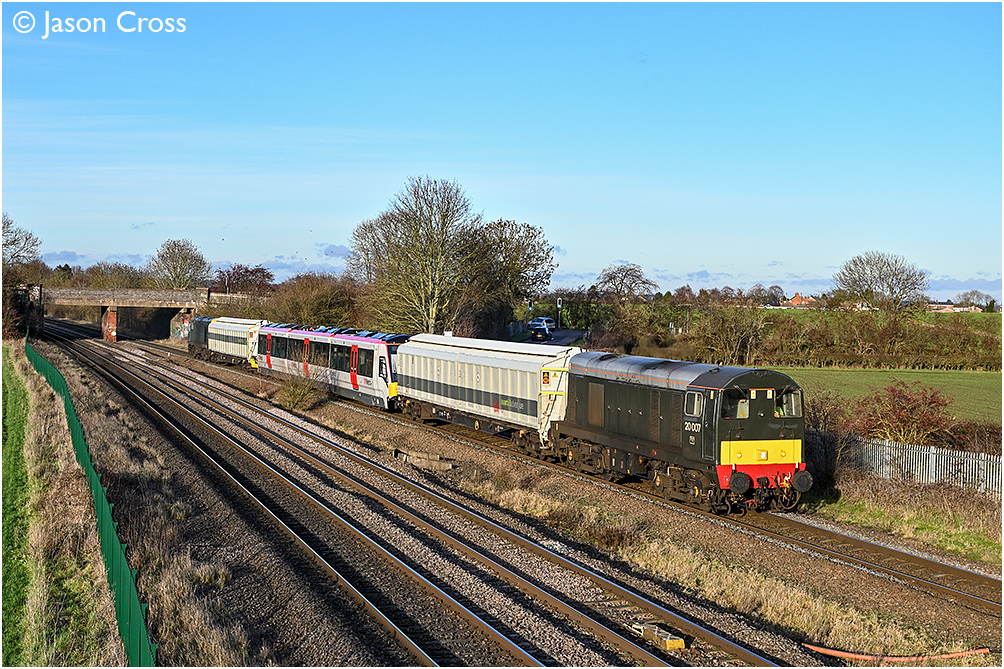 'Tram-Train' 398020 sandwiched between them as they pass Thurmaston with a 6Q37