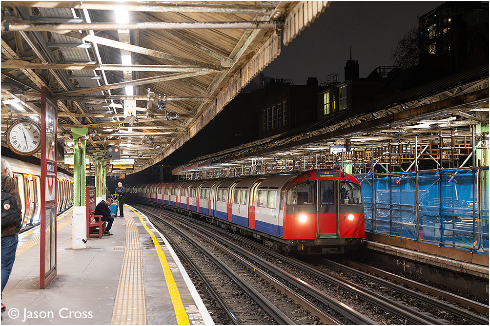 A Cockfosters bound Piccadilly Line train of 1973 Tube Stock crawls through Barons Court where the eastbound platforms are closed for refurbishment. Date: 10 February 2026 Manipulation Notes: None