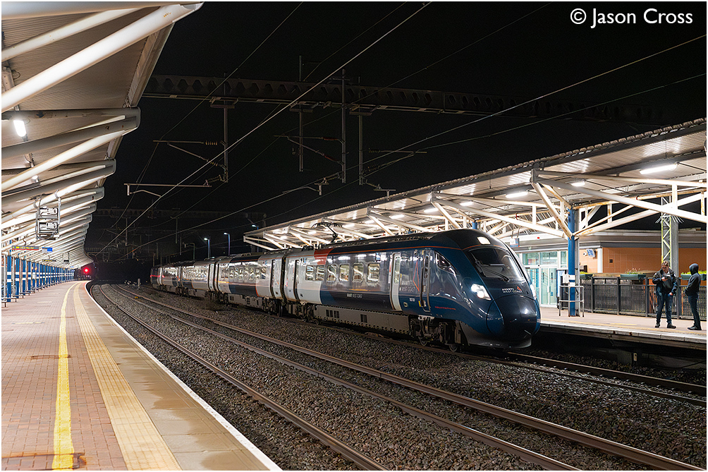 805009 arrives at Rugby's platform 1 with the 9G44 2016 London Euston to Birmingham New Street Avanti service. Date: 12 February 2026 Manipulation Notes: None