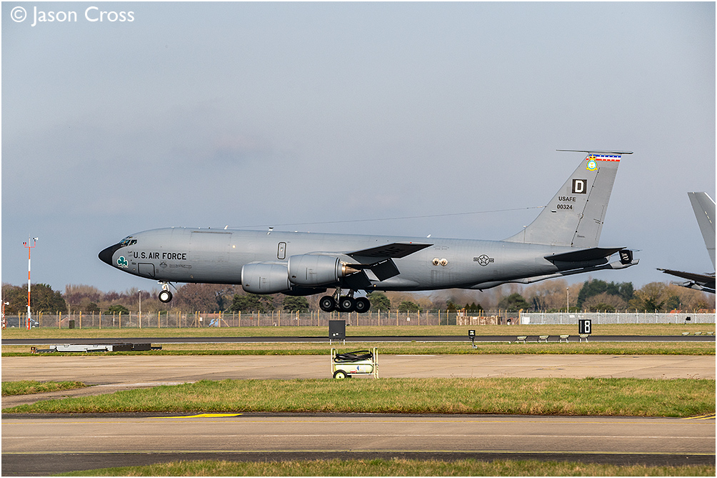 USAF Boeing KC135 Stratotanker 60-0324 landing on runway 28 at RAF Mildenhall. Date: 25 February 2026 Manipulation Notes: None