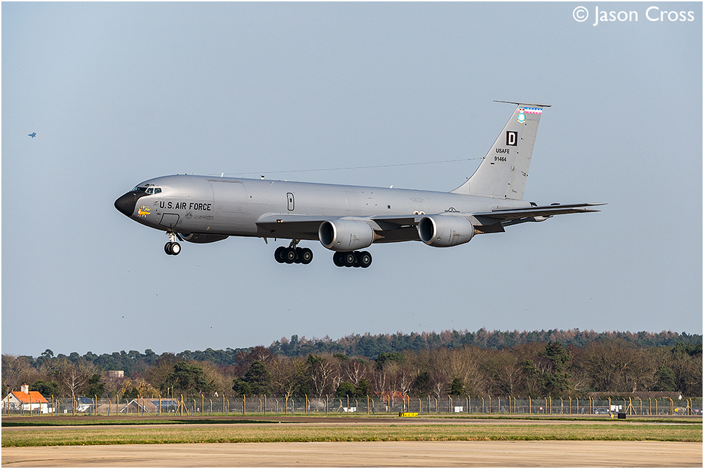 USAF Boeing KC135 Stratotanker 59-1464 landing runway 28 at RAF Mildenhall. A USAF F35A can be seen in the circuit at nearby RAF Lakenheath. Date: 25 February 2026 Manipulation Notes: None