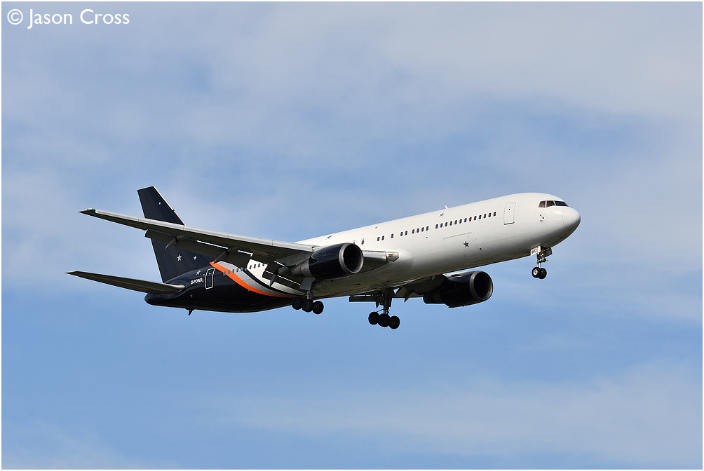 Titan Airways Boeing 767 G-POWD lands at East Midlands Airport with a charter flight from Calgary, Canada. Date: 22 March 2020 Manipulation Notes: None